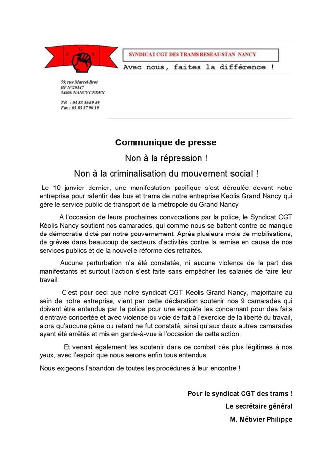 - 8h15 - Rassemblement anti-répression (suite affaire Kéolis et 13 avril) - Cité judiciaire – Nancy
