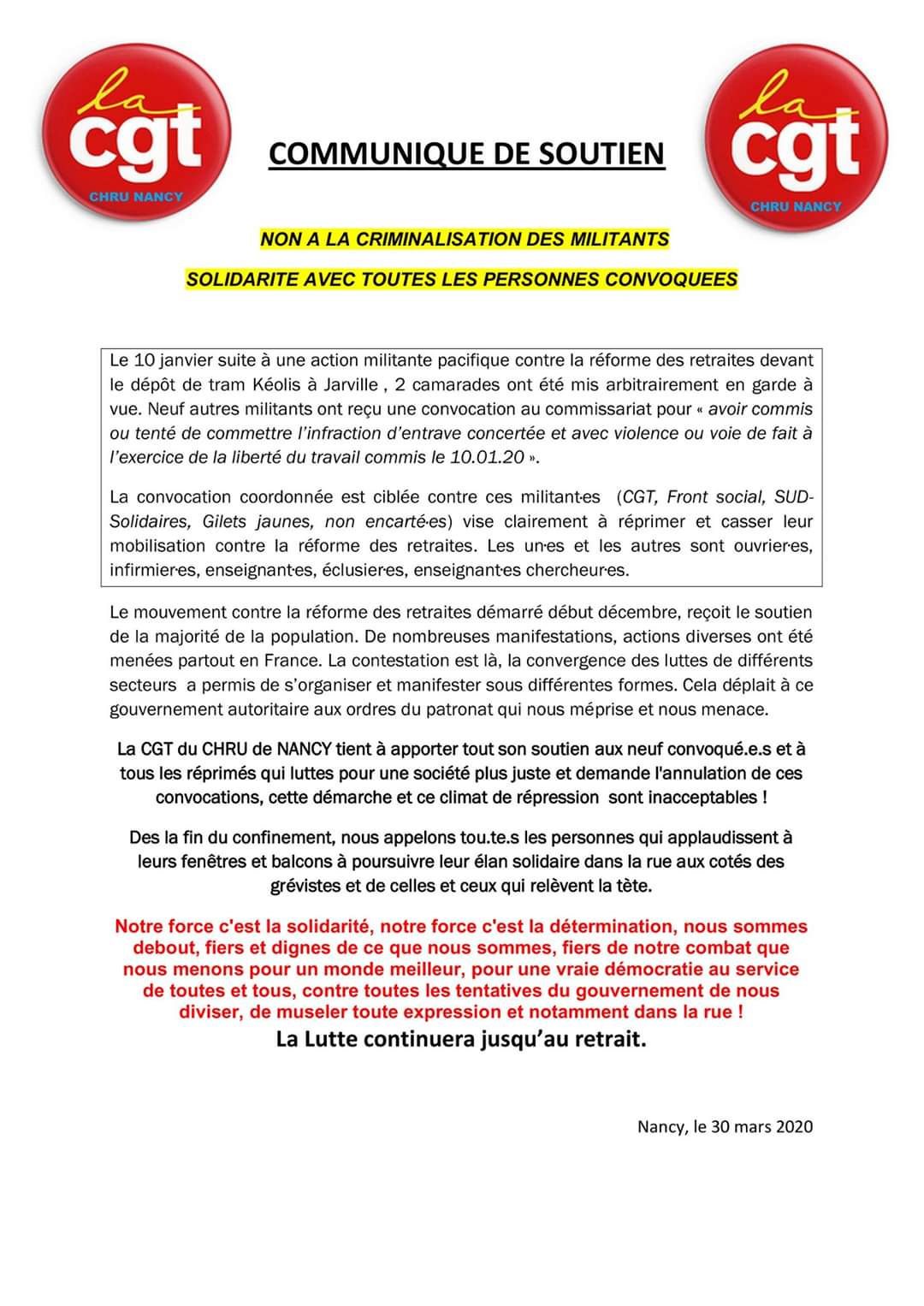 Convocations suite au 10 janvier. Communiqué intersyndical Nancy