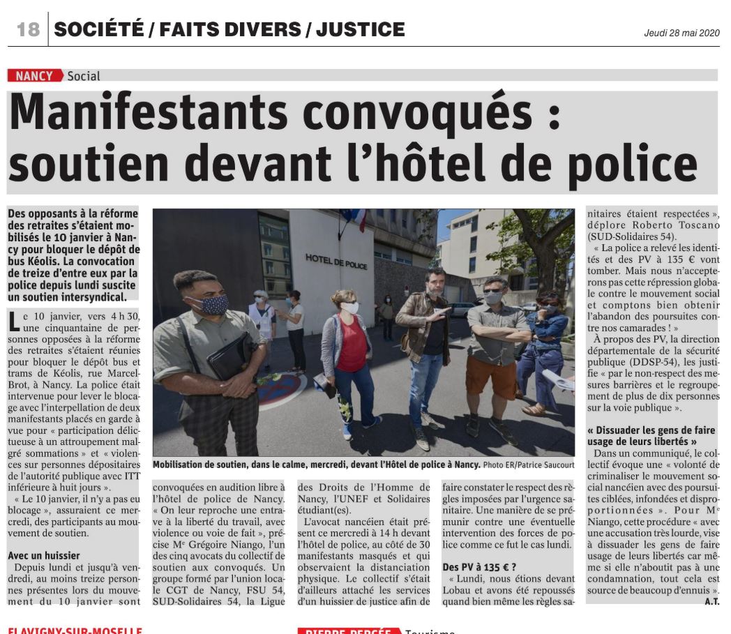 - Manifestants convoqués : mouvement de soutien devant l’hôtel de police, Est Rep, 27 mai